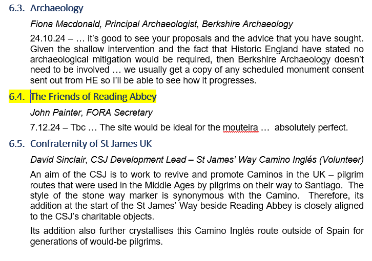 23 October 2025 Camino Way Marker on Chestnut Walk. The way marker for the start of the St James' Way Camino (pilgrimage route) is due to be opened on Wednesday 19th November at 10.30am. The UK part of the St James' Way runs from the ruins of Reading Abbey to Southampton and is the start of a route to the shrine of St James at Compostela in northwestern Spain. Friends thinking of visiting the ruins are welcome to attend this event. The location is at the west end of Chestnut Walk, close to where the Holy Brook runs into the River Kennet. Photos: The St James' Way marker during installation ; Location chart ; Planning information about the marker. |