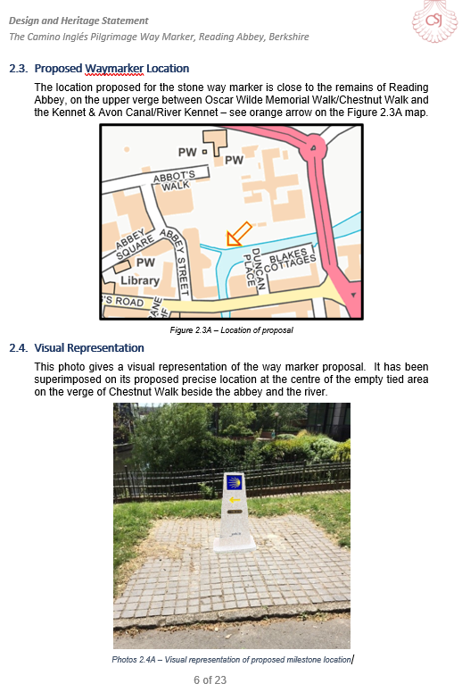 23 October 2025 Camino Way Marker on Chestnut Walk. The way marker for the start of the St James' Way Camino (pilgrimage route) is due to be opened on Wednesday 19th November at 10.30am. The UK part of the St James' Way runs from the ruins of Reading Abbey to Southampton and is the start of a route to the shrine of St James at Compostela in northwestern Spain. Friends thinking of visiting the ruins are welcome to attend this event. The location is at the west end of Chestnut Walk, close to where the Holy Brook runs into the River Kennet. Photos: The St James' Way marker during installation ; Location chart ; Planning information about the marker. |